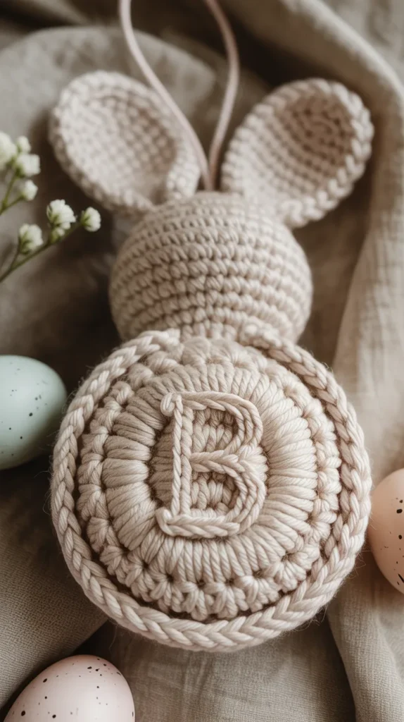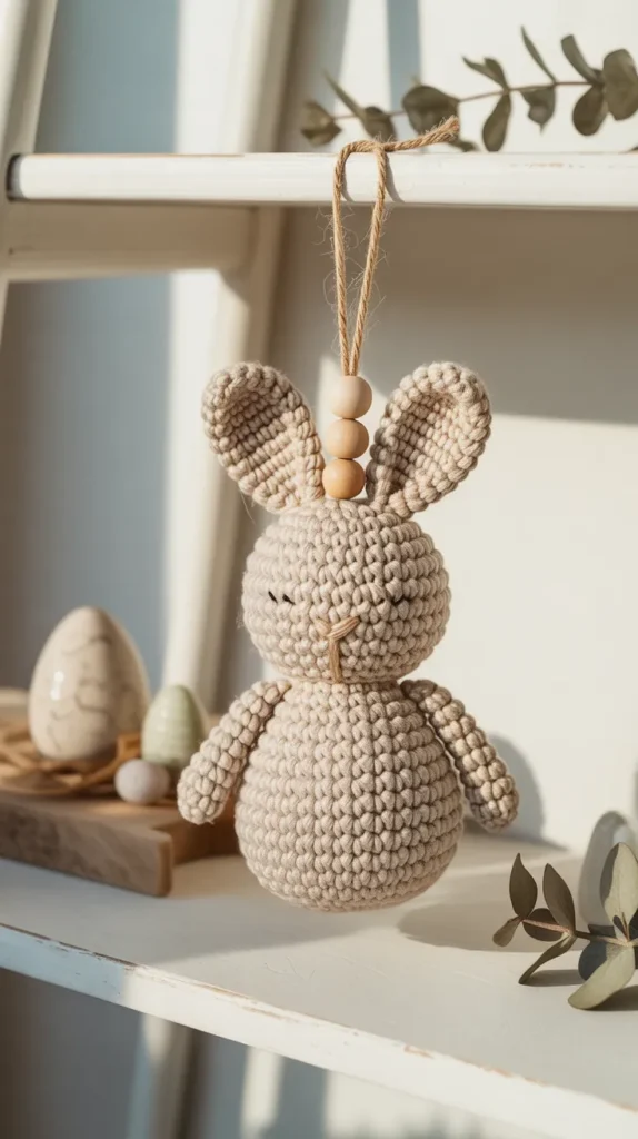 Neutral bunny ornaments use beige, cream, or light gray yarn paired with twine hangers or wooden beads. This style fits modern farmhouse homes and minimalist Easter decor. The simple color palette makes it easy to mix with existing decorations, saving money year after year.