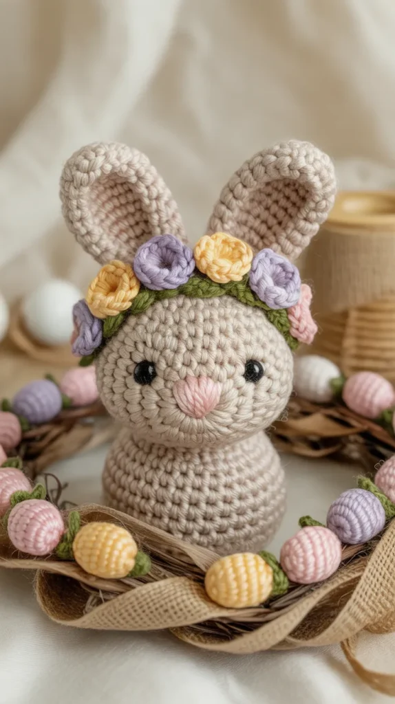 A floral crown bunny ornament adds a sweet cottage-style look to Easter decor. Small crochet flowers or embroidered blooms sit gently between the bunny’s ears, creating a charming spring accent. This style looks beautiful on Easter garlands, nursery walls, or gift baskets.