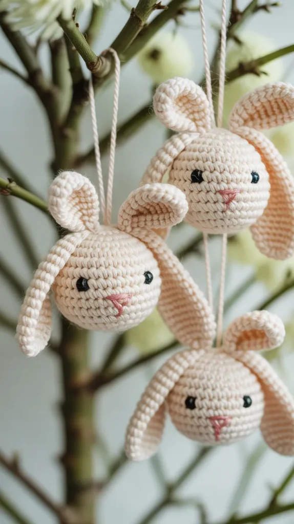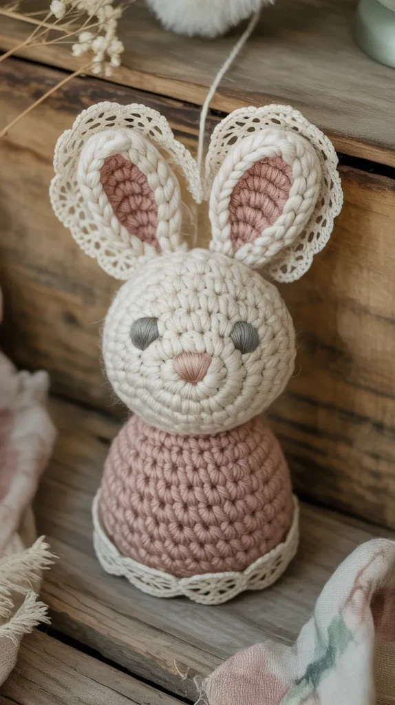 Vintage bunny ornaments use muted colors, lace trim, and soft cotton yarn. They feel nostalgic and pair beautifully with farmhouse decor. This style creates heirloom charm without the cost of antiques.