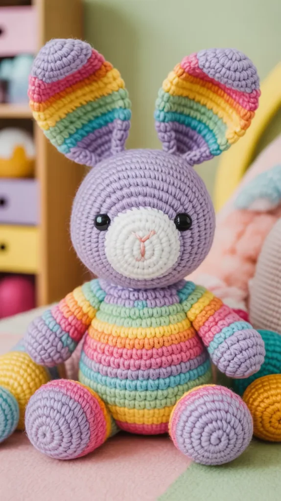 Rainbow bunnies use bright yarn stripes or colorful ears. They’re perfect for playful homes and kids’ rooms. Scrap yarn works great here, making this a very budget-friendly option.