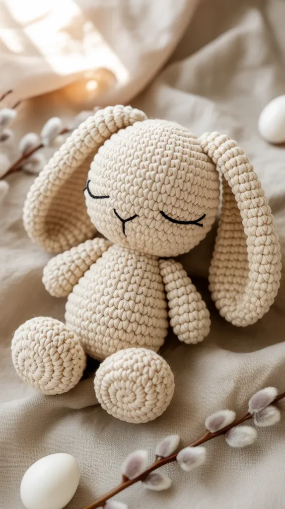Sleeping bunny ornaments feature closed stitched eyes and relaxed ears. This calming style works beautifully in bedrooms, nurseries, and peaceful Easter displays. Because it uses fewer embellishments, it’s simple to repeat and cost-effective.