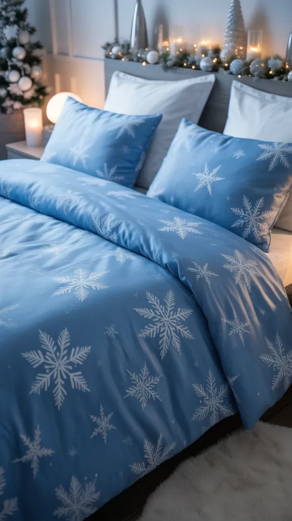 They bring a frosty elegance to your bedroom without overwhelming it. Add white fairy lights or blue throw blankets to complete the peaceful winter vibe.