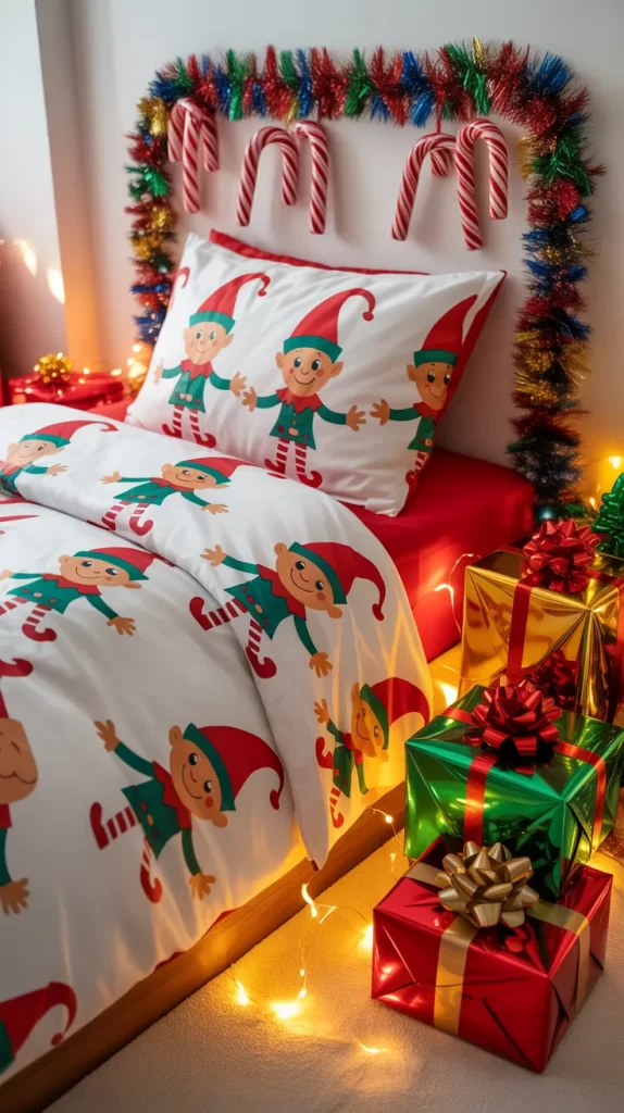 Make your bedroom playful with elf-printed sheets! Colorful elves, gifts, and candy canes create a lively and cheerful design that screams Christmas fun.