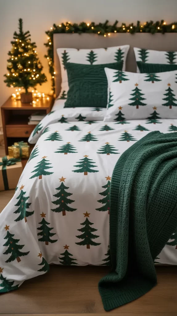 Go classic with Christmas tree-printed sheets! Whether tiny trees or large patterns, this design feels festive and cheerful without being too busy.