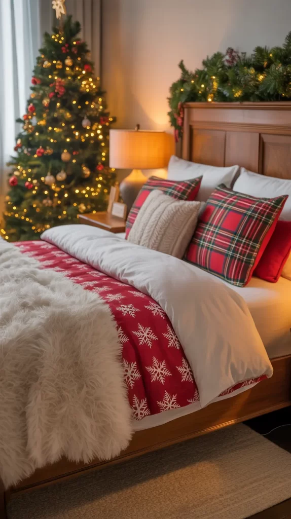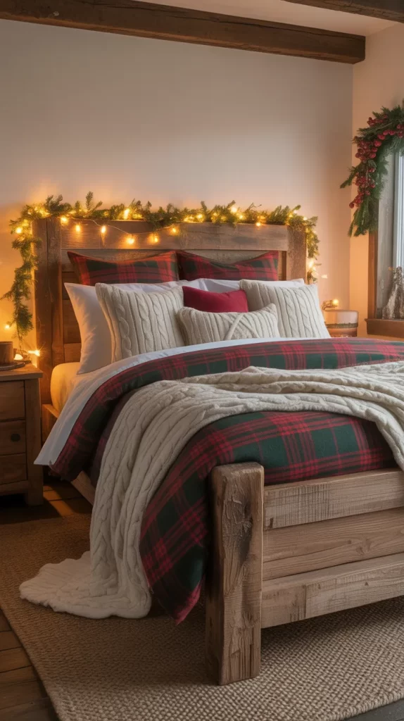 Green plaid brings that rustic, cabin-in-the-woods feeling perfect for Christmas. It’s simple yet stylish, reminding you of cozy firesides and mugs of hot cocoa. Combine it with red throw blankets or wooden bedroom decor to complete the festive vibe.