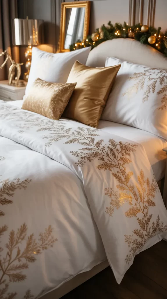 For an elegant and dreamy Christmas look, go for gold and white. This combo feels luxurious and festive without being too loud. Gold snowflakes, stars, or tree prints on crisp white sheets make your room sparkle beautifully.