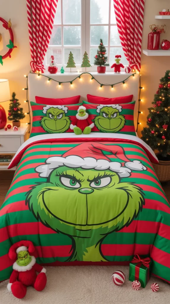 Add a playful twist with Grinch-themed bedding! Bright green sheets featuring the Grinch, Max the dog, and Christmas trees are fun and festive for kids and adults alike.