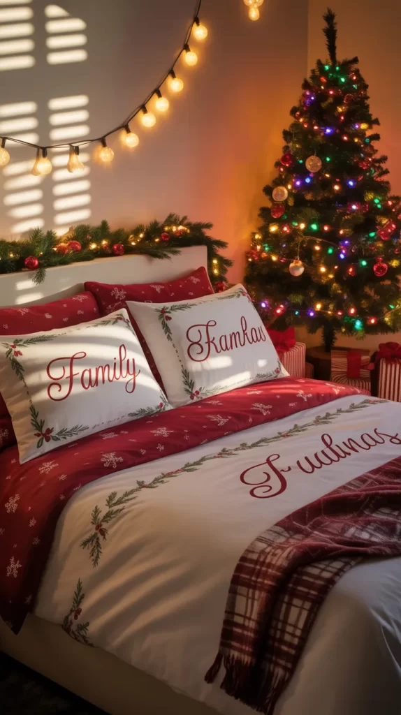 Make your bedroom extra special with personalized bed sheets! Add names, initials, or festive quotes like “Merry Christmas” or “Let It Snow.”
