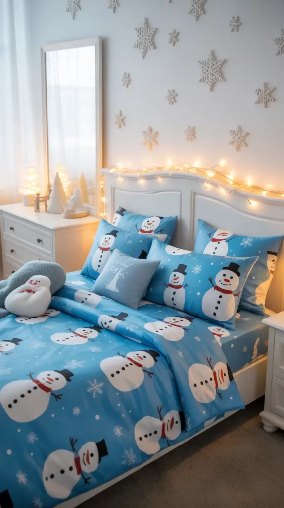 If you love icy tones, blue winter wonderland sheets are a great pick. Patterns with snowflakes, stars, or pine trees in shades of blue and white feel calm yet festive.