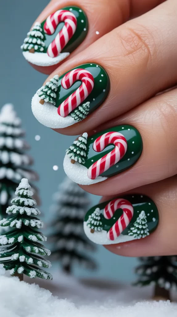 Imagine a forest made entirely of candy canes, with minty red-and-white trees sprouting from fluffy white snow. This playful 3D nail idea mixes sweetness and festive charm, creating a design that’s both cheerful and eye-catching.