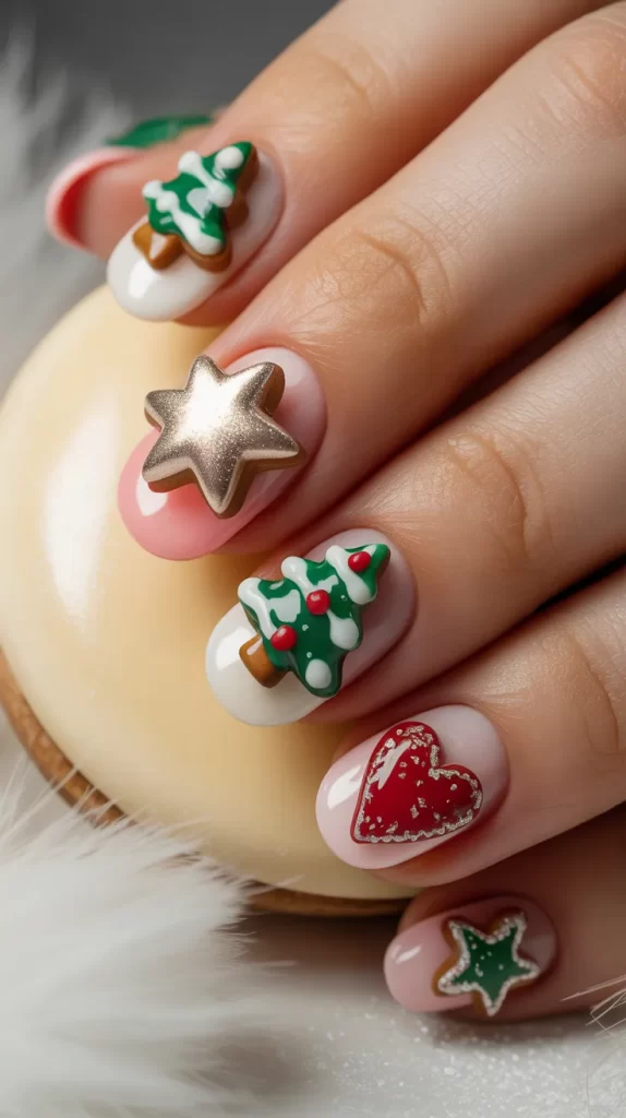 Each nail looks good enough to eat, decorated with red and green frosting, candy dots, and shimmering sugar dust. It’s playful, cozy, and perfect for bakers or cookie lovers.