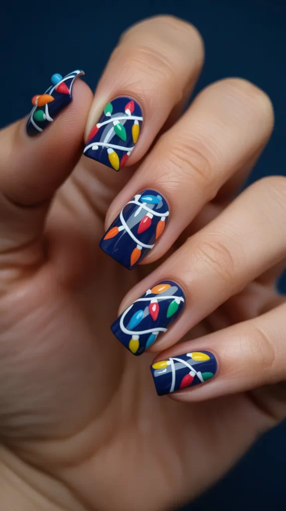 Bring sparkle and brightness to your fingertips with a 3D Christmas lights theme. Tiny raised bulbs in red, green, yellow, and blue wrap across each nail, glowing against a soft white or night-sky base.