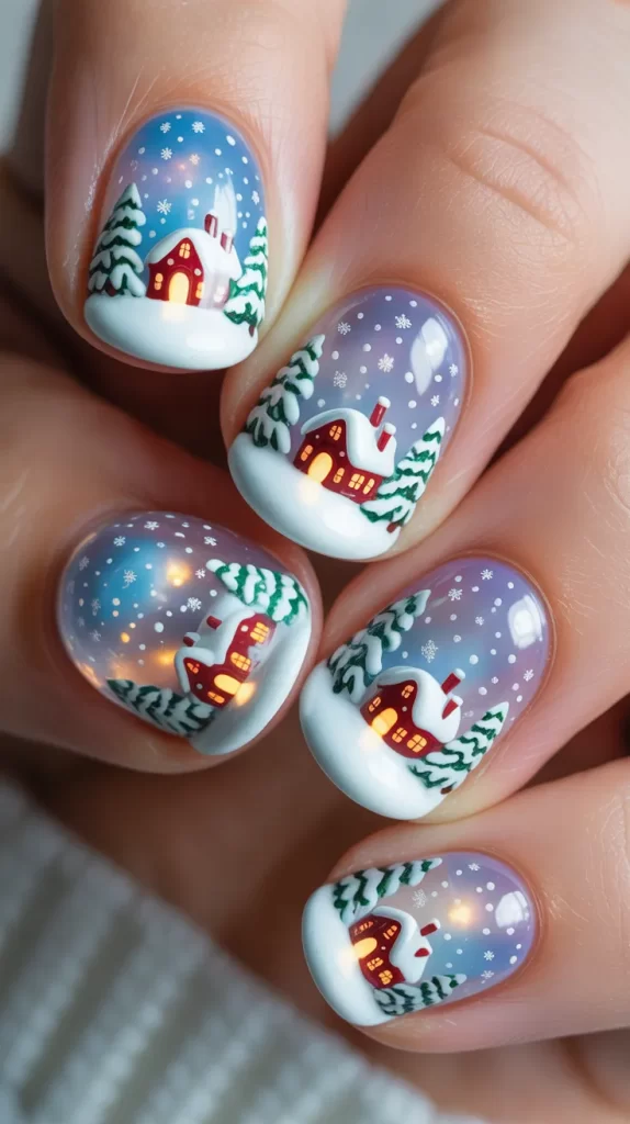 Inspired by the magic of snow globes, this design creates a miniature village scene with tiny houses, trees, and glittery snowfall trapped under a glossy dome. Each nail looks like its own globe, with curved glass reflections adding realism.