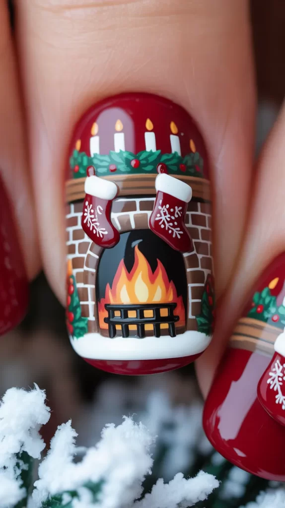Turn your nails into tiny holiday hearths with glowing 3D fireplaces, stockings, and warm flames. The background can be a rustic brick texture, with tiny details like garlands, pinecones, and golden embers flickering.