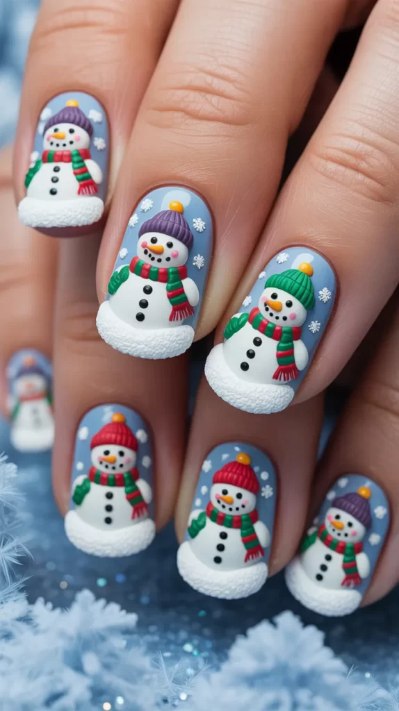 Turn each fingertip into a winter playground with adorable little snowmen wearing scarves and hats. Use a soft icy-blue base with a snow-textured tip for that frosty effect. Each nail can feature a slightly different pose—one snowman holding a broom, another smiling with mittens.