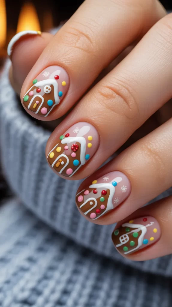 Imagine your nails turned into tiny Christmas villages with adorable gingerbread houses surrounded by snowy frosting. Each nail looks like a cozy little home, decorated with icing windows, candy rooftops, and sugar dots. Add a soft pastel background to create a sweet and heartwarming winter scene.