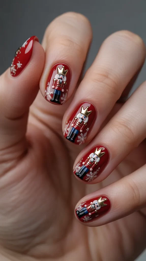 Add gold borders or tiny gems for a regal finish. It’s elegant, storybook-inspired nail art that brings nostalgia and class to your Christmas look.
