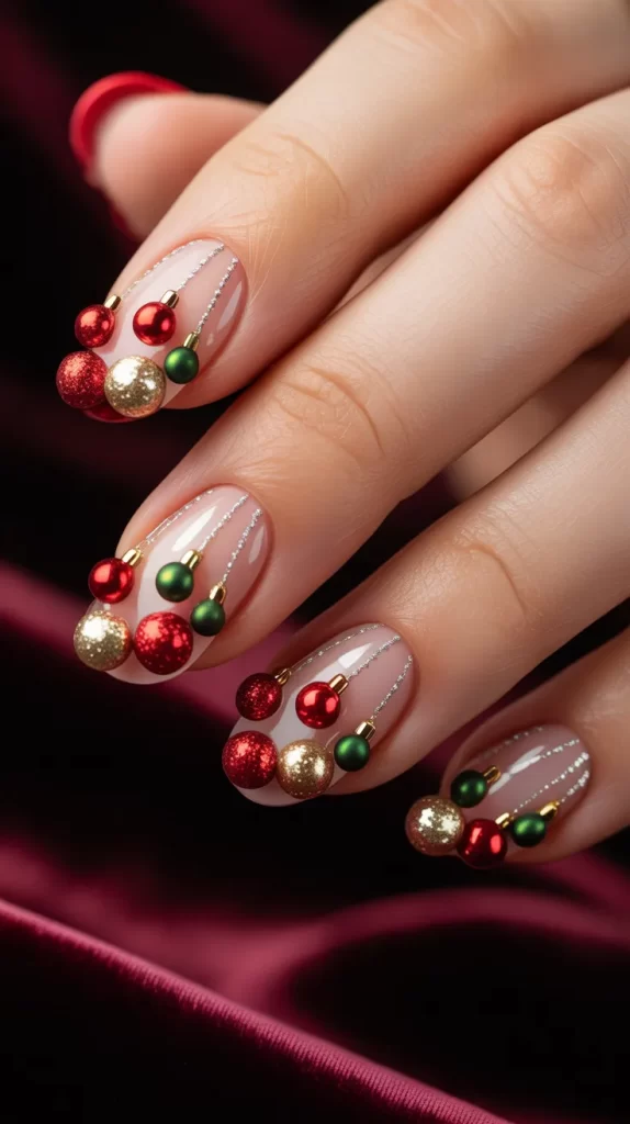 Transform your nails into mini versions of hanging Christmas ornaments! Each nail can have a different 3D ornament design—gold baubles, glittering red spheres, or even glass-style snowflakes dangling from a silver thread.