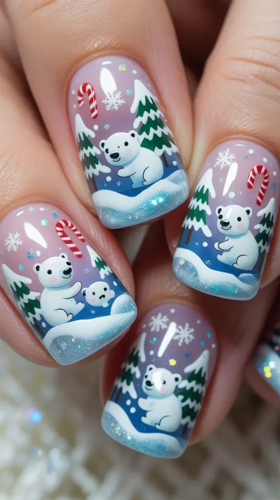 Adorable polar bears playing in the snow make this 3D nail art irresistibly cute. Set against a soft icy-blue or white background, tiny polar bears can sit, slide, or hold candy canes among glittering snowflakes.