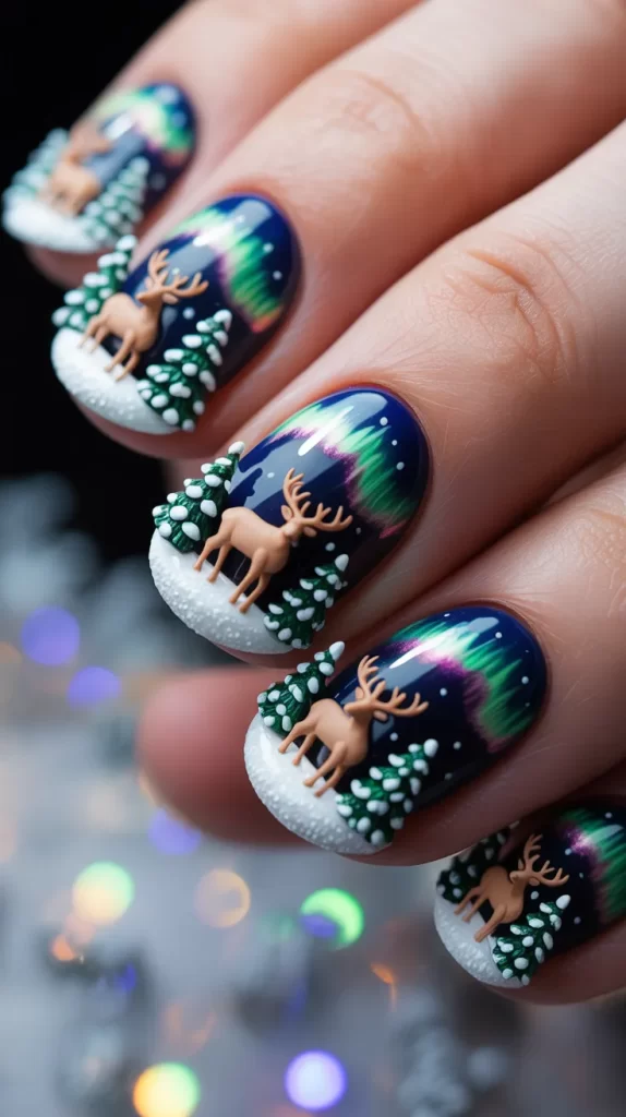 Capture the magic of the Arctic sky with a tiny 3D winter scene featuring reindeer standing under colorful northern lights. The nails have a deep midnight gradient—blending dark blue, violet, and green with shimmering aurora streaks above snow-covered ground.