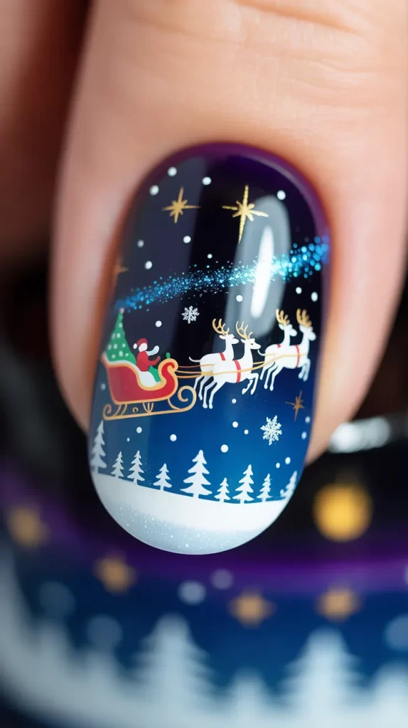 Bring Santa’s joyful journey to life right on your fingertips. Picture a tiny sleigh gliding across a snowy night sky, led by miniature reindeer figures and surrounded by glimmering stars. The base can be deep midnight blue, creating the perfect contrast for white snow and golden sparkles.