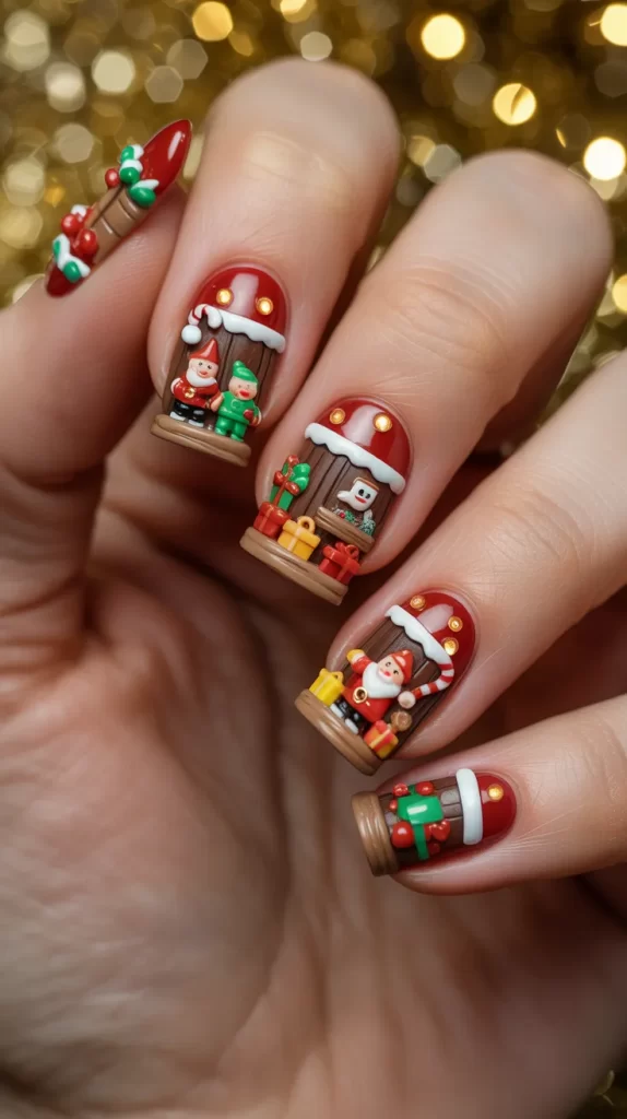 Imagine each nail showing a different corner of Santa’s workshop — tiny 3D toys, gift boxes, and little elves at work. Use a warm red and wooden-brown color palette for a cozy workshop vibe.
