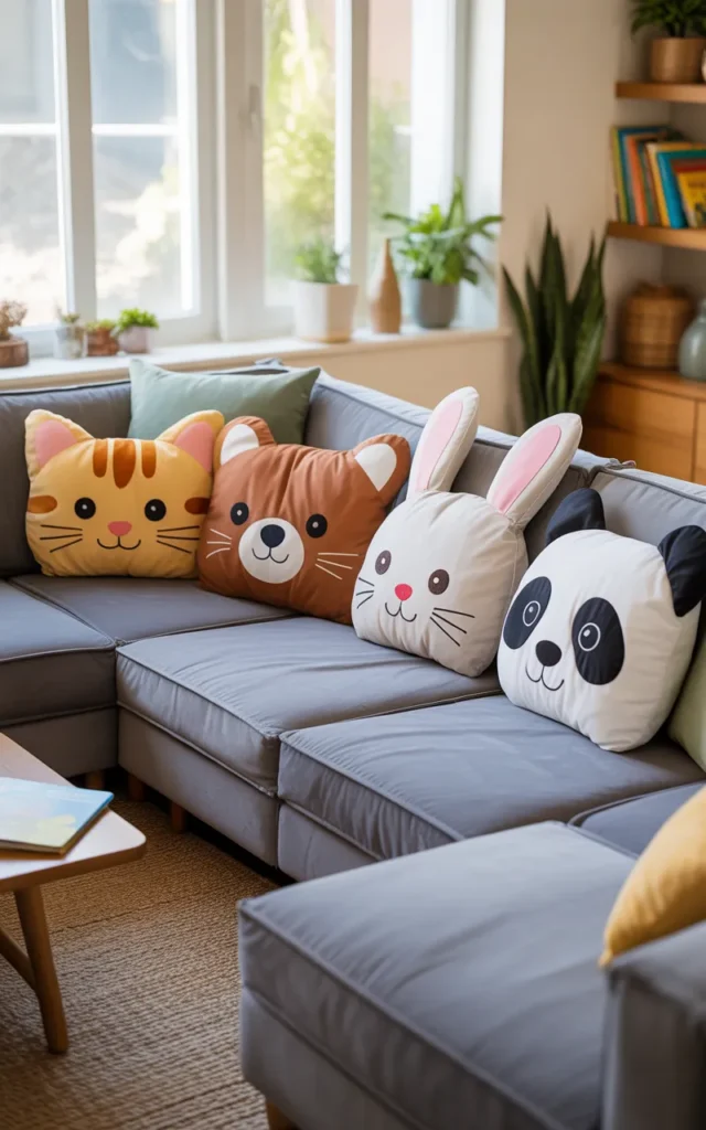 Animal face throw pillows with cats, bears, rabbits, or pandas bring fun energy into a room. They are great for family homes, kids spaces, or playful apartment decor. Use one or two animal pillows with plain pillows so the sofa looks balanced and not crowded.