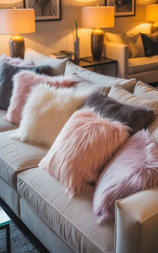 Faux fur throw pillows make any sofa feel softer and more inviting. Choose blush pink, ivory, gray, or lavender for a cute and stylish result. The fluffy texture adds depth to plain furniture and works especially well in winter decor.