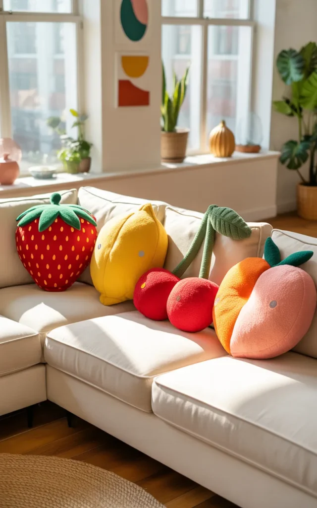 Fruit shape throw pillows like strawberries, lemons, cherries, or peaches bring playful color into your sofa styling. They are fun for spring and summer decor or cheerful family spaces. Bright shapes look best with plain couches.