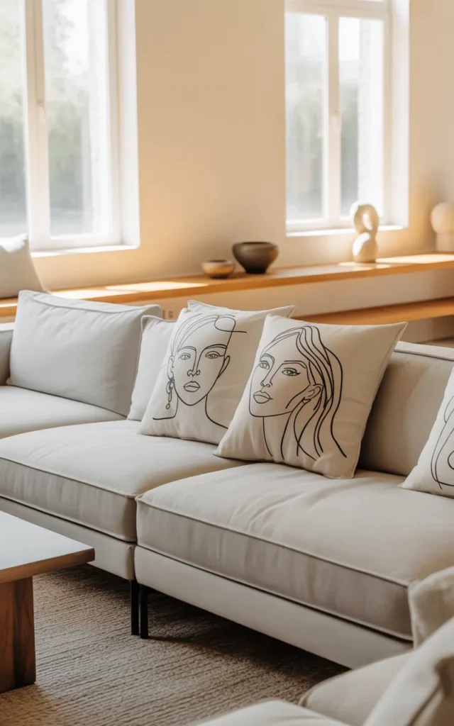 Minimal face line art pillows use simple abstract drawings in black or brown lines on cream fabric. They are cute in a modern artistic way and fit many home styles. These pillows work beautifully with neutral sofas and wood furniture.