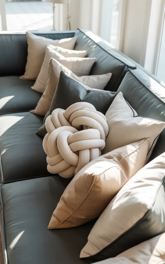 Knot pillows are one of the most stylish cute pillow trends. Their twisted shape looks modern, playful, and artistic at the same time. Soft tones like cream, sage, blush, and gray blend beautifully with modern sofas and minimalist rooms.