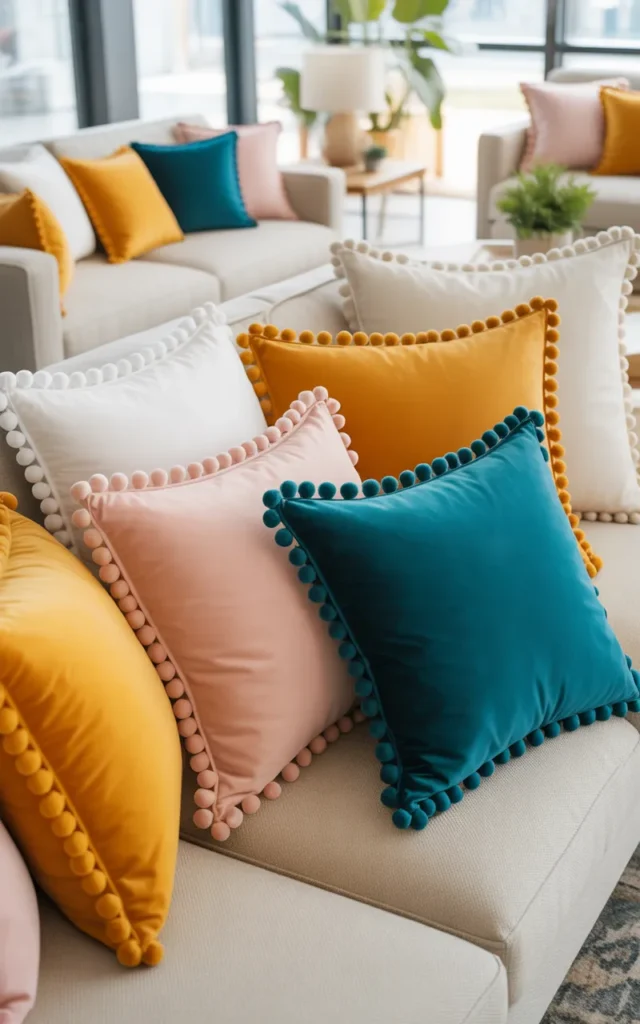 Pom pom edge pillows are simple square pillows with fun trim around the edges. They add movement and texture without bold patterns. White, blush, mustard, or teal versions work beautifully in many rooms.