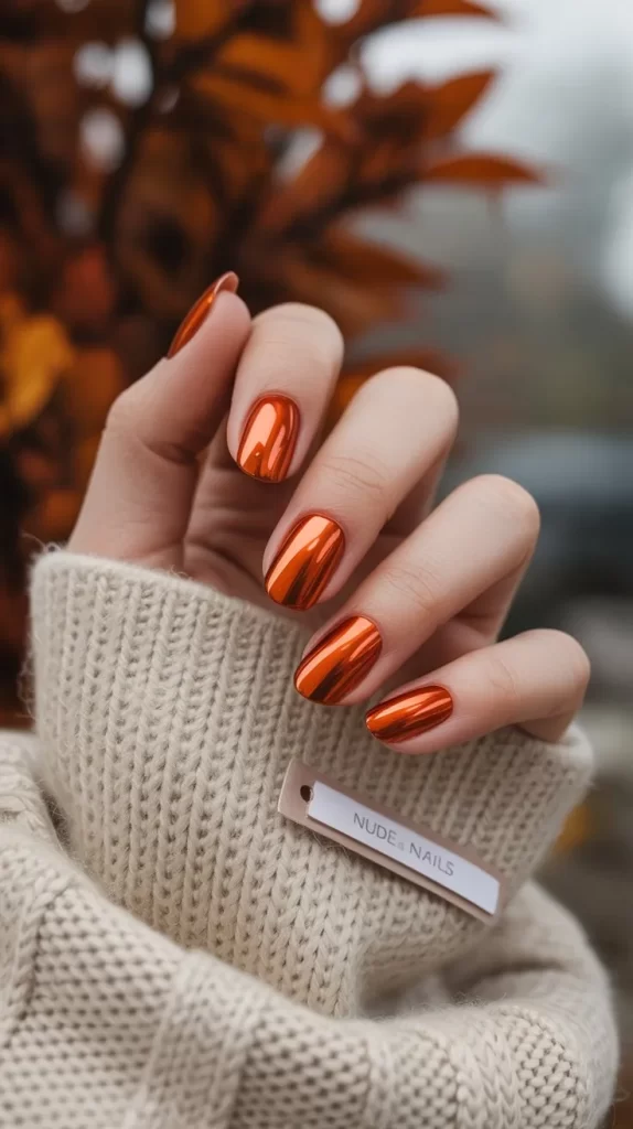 French tips get a fiery fall makeover with a burnt orange chrome finish.