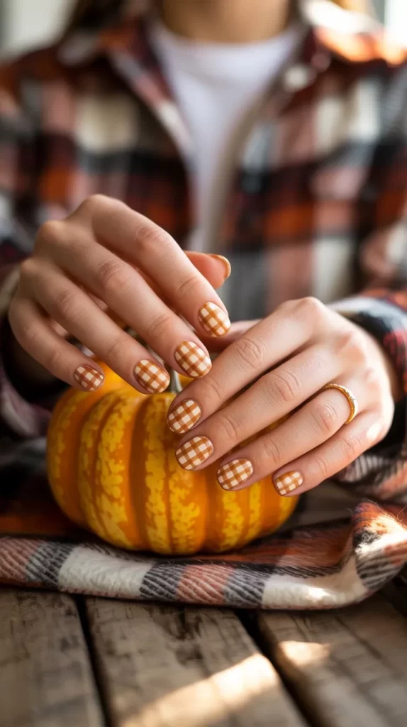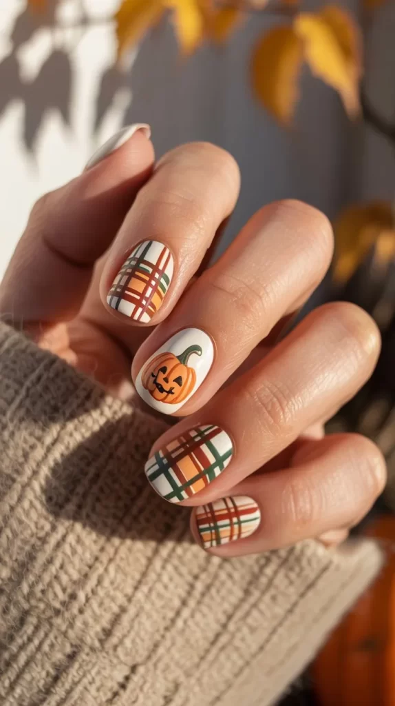 Think cozy flannel vibes with a cute little pumpkin on an accent nail.