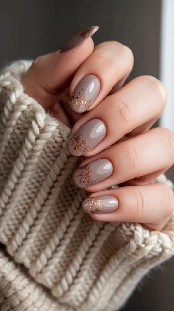 Taupe nails with a pop of copper glitter for a subtle sparkle.