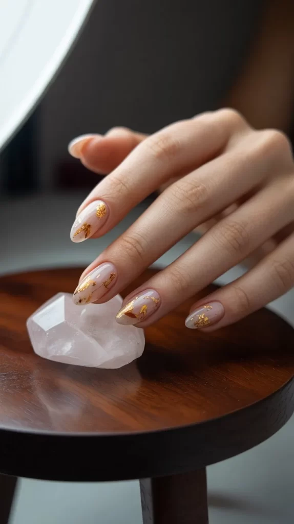 Clear nails with subtle autumn colors and gold foil for a touch of glam.