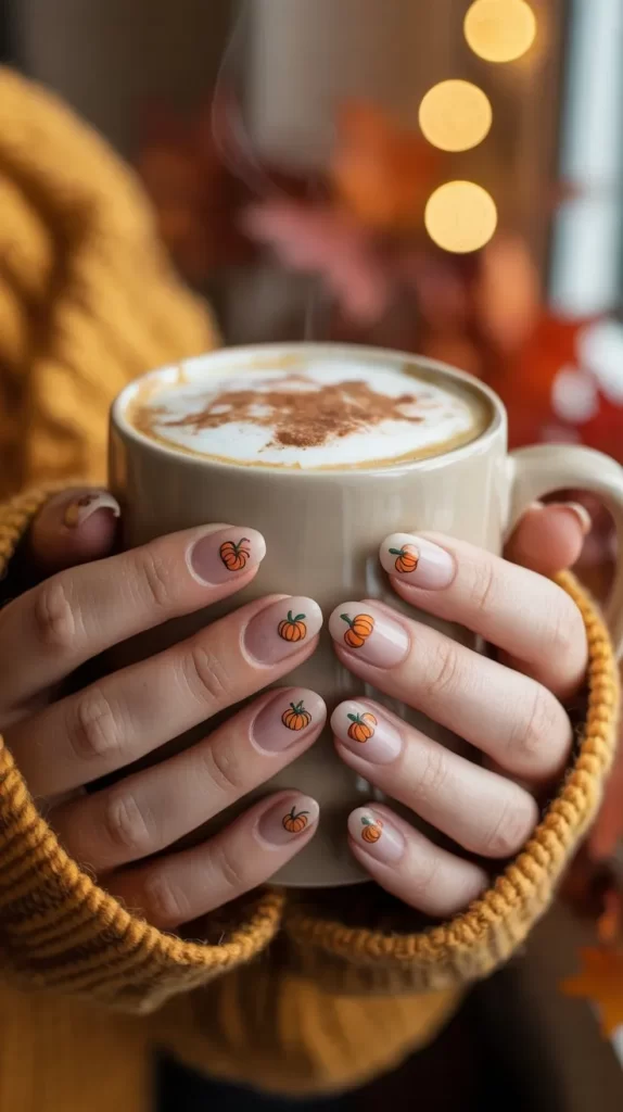 A playful twist on the French mani with tiny pumpkins replacing the tips.