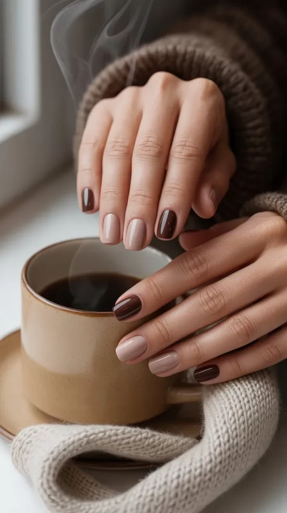 - Use tape or a nail art brush to create checker patterns with cinnamon brown polish.