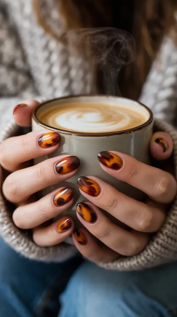 Trendy tortoiseshell patterns with autumn tones of amber, black, and brown.