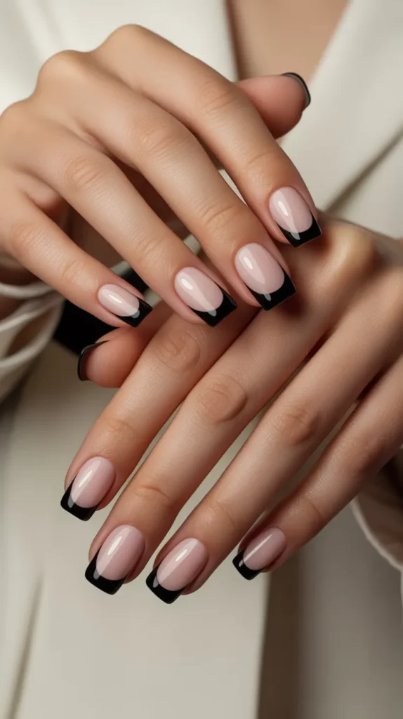 Black French tip nails are a trendy take on a classic design. The dark tips add drama while keeping the base neutral and clean. This look feels modern and romantic at the same time.