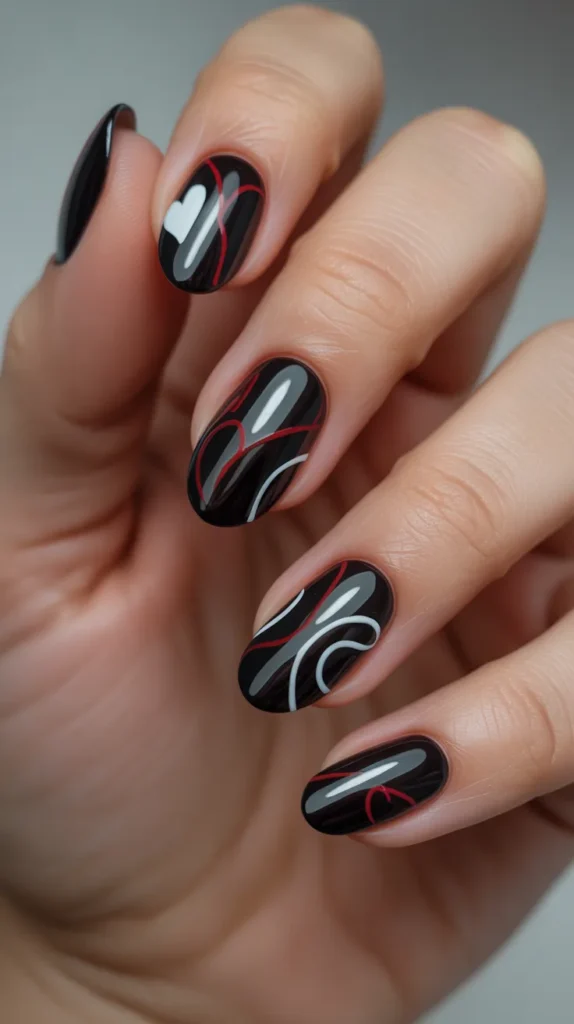 Minimal line art on black nails creates a modern and artistic look. Thin white or red lines add interest while keeping the design clean and stylish. This trend is popular for bold Valentine’s Day nails.