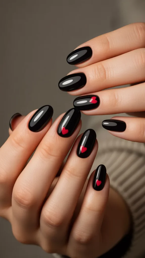Black nails with red heart accents mix romance with drama. The dark base makes the hearts stand out, creating a trendy Valentine’s Day design that feels bold but still playful. This look works well for photos and social media.