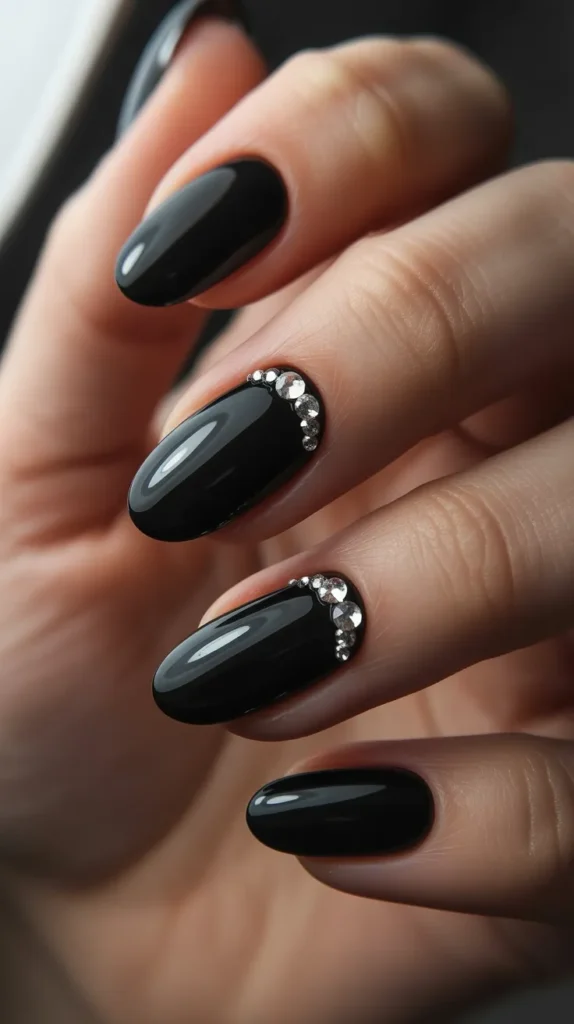 Tiny rhinestones on black nails add subtle glamour. Placing them near the cuticle or on one nail keeps the look balanced and trendy. This style feels romantic without being flashy.