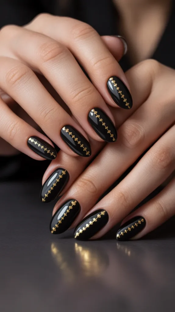 Black nails with gold accents feel luxurious and trendy. Thin gold lines or dots add elegance without overpowering the design. This look is perfect for special Valentine’s Day celebrations.