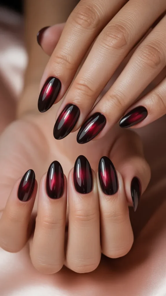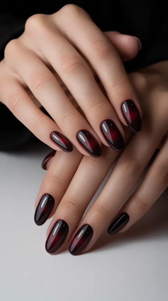 Dark ombre nails blend black, burgundy, or deep red shades for a smooth gradient effect. This design looks professional and trendy, especially in photos.