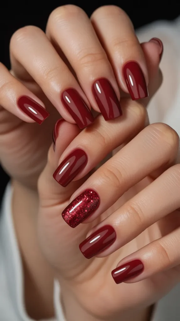 Dark red nails with a glitter accent add sparkle while keeping the look romantic. Using glitter on one nail creates balance and avoids excess shine. This style is popular for evening events.