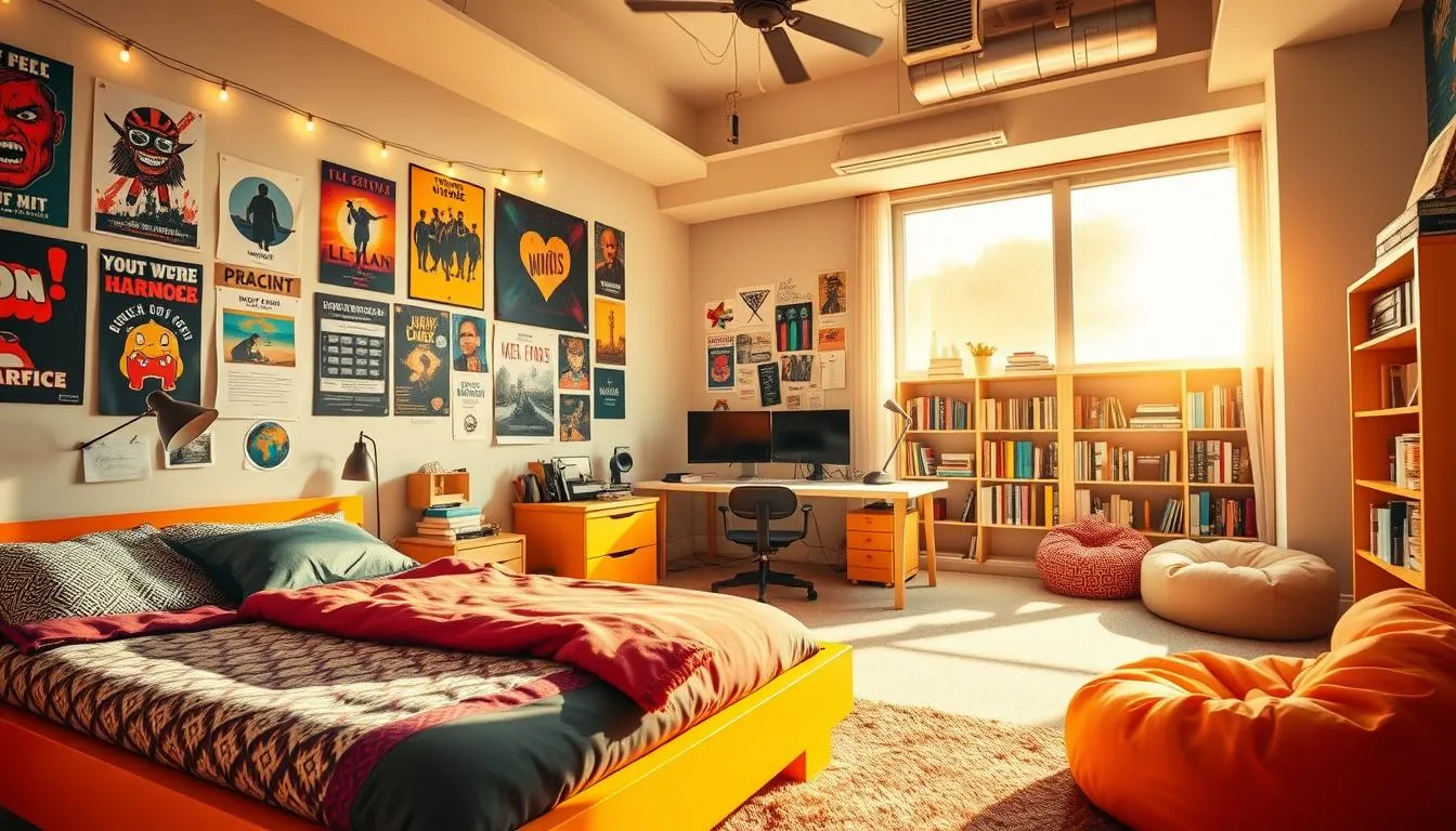 Start by setting up different zones for study, sleep, and hanging out. This keeps things neat and focused.