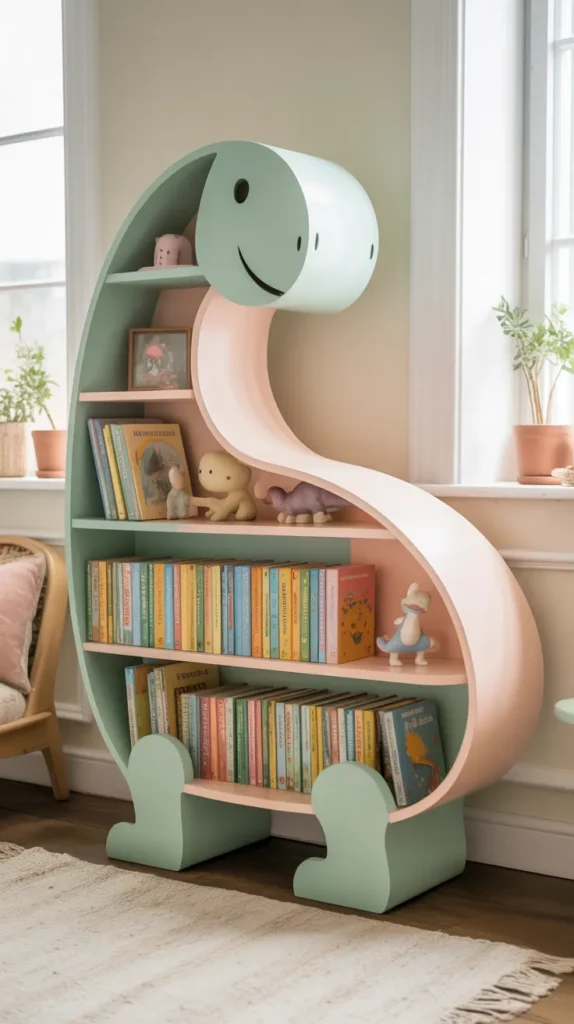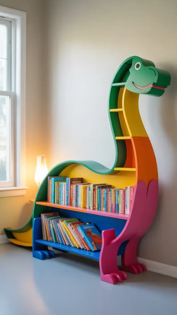 Bright colors make a dinosaur bookshelf more engaging for kids. Each shelf can be painted in different shades to create a playful look. MDF material keeps it affordable and easy to customize.