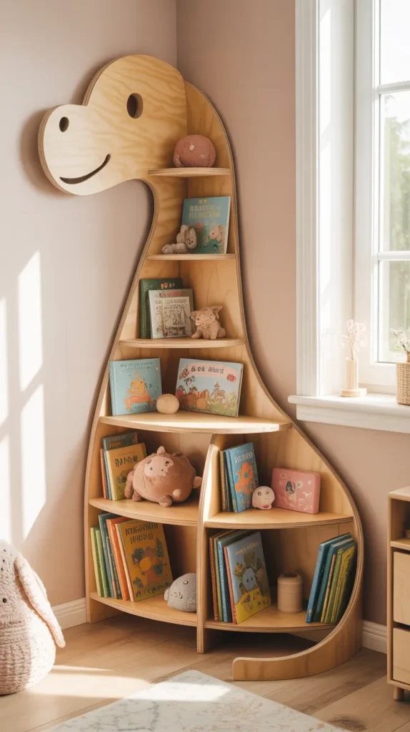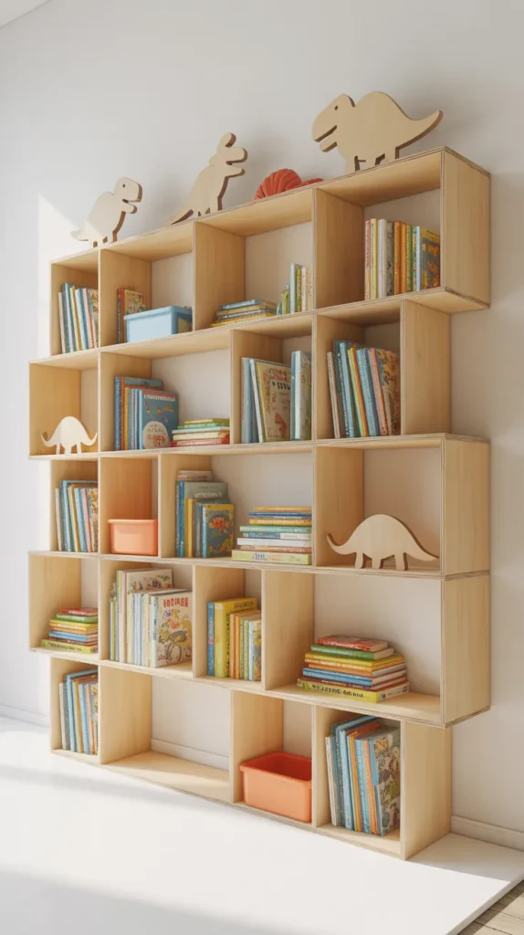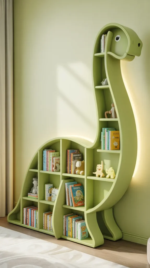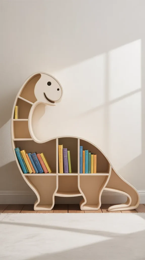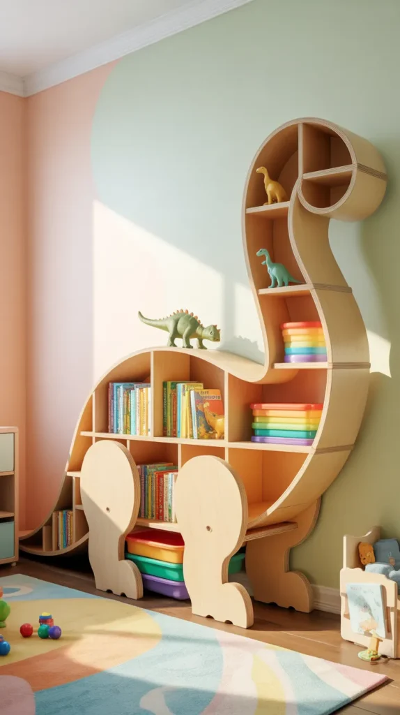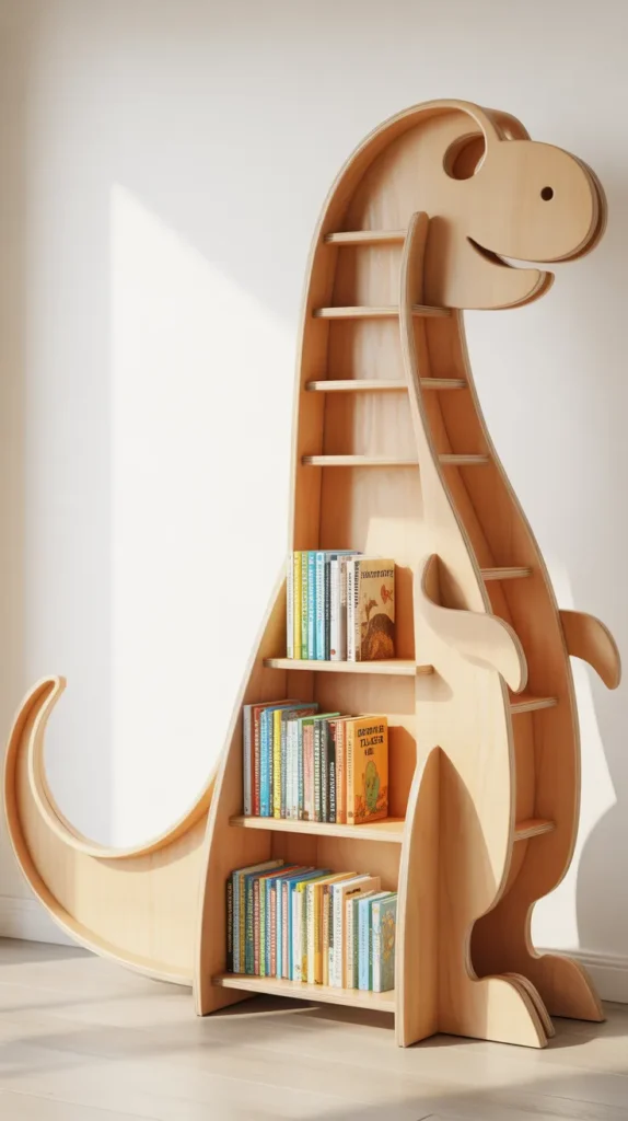 Wall-mounted dinosaur shelves are perfect for saving space. These shelves are shaped like dinosaur silhouettes and fixed on the wall. Plywood makes them durable while keeping the cost affordable.
