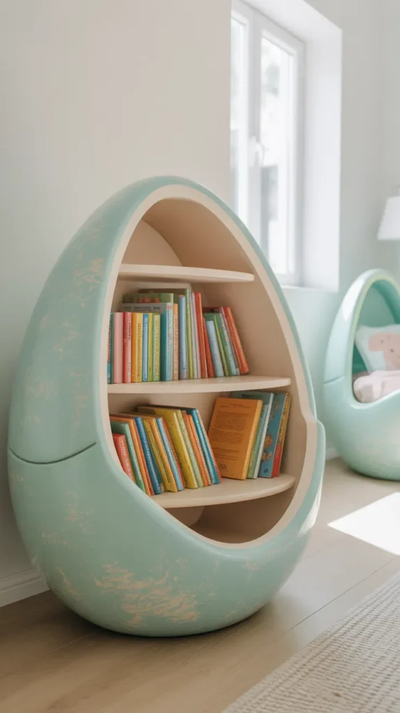 A dinosaur egg-shaped bookshelf adds a creative twist to kids room storage. The rounded shape with cut-out sections makes it safe and visually appealing. MDF construction keeps it affordable and easy to maintain.